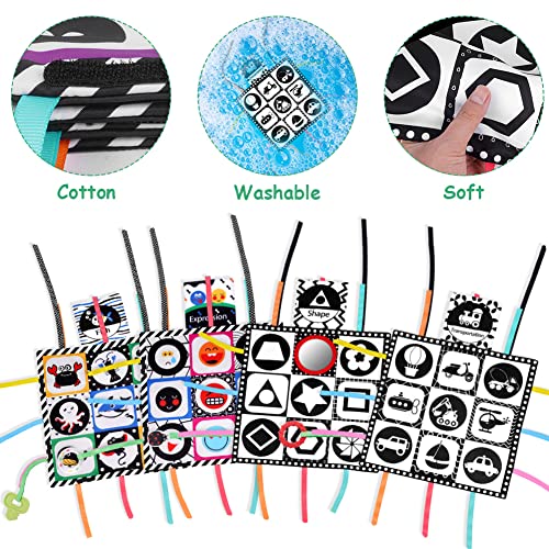 【AMPIA APPLICAZIONE】Oltre ad essere posizionati sul pavimento o sul letto come addominoplastica, questi giocattoli sensoriali in bianco e nero possono essere appesi al muro e fissati a una culla, un passeggino o un seggiolino per auto con cui i bambini