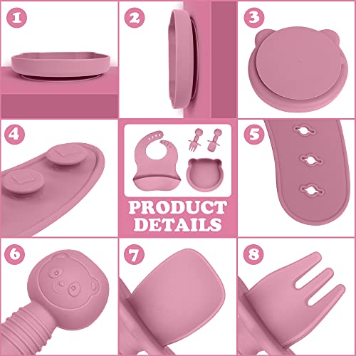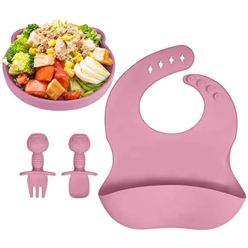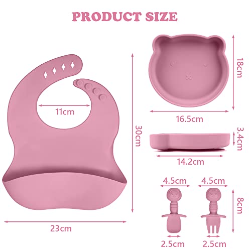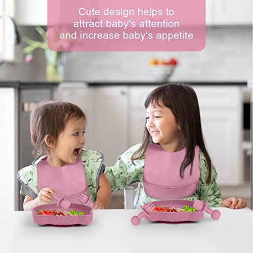 Vicloon Set Pappa per Bambini Silicone, 4 Pezzi Set Pappa Svezzamento Bambini, Silicone Bavaglino e Piatto con Ventosa Cucchiaio Forchetta Forma di Orso, Set Svezzamento Silicone senza BPA - Rosa