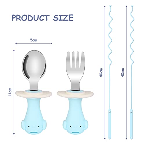 Vicloon Set di Posate per Bambini, Cucchiaio e Forchetta per Bambini con Corda Elastica, Posate Da Bambino in Acciaio Inossidabile 316, Senza BPA, con Scatola (Forma di Pinguino Blu)