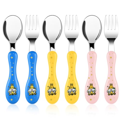 Vicloon Set di Posate per Bambini, 6 Pezzi Set Posate Bambini in Acciaio Inox Senza BPA, Posate per Bambini con 3 Forchette 3 Cucchiaio, Posate Bimbi per Ragazze e Ragazzi Casa Scuola, Blu Rosa Giallo