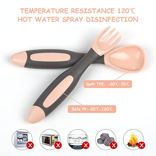 【Il Cucchiaio e Forchetta può Essere Piegato】Diverso dagli altri cucchiaio e forchetta per bambini, il nostro cucchiaio e forchetta da allenamento è morbido e può essere piegato a varie angolazioni.È adatto a diverse posizioni di presa dei bambini e consente ai bambini di imparare a mangiare in modo indipendente.