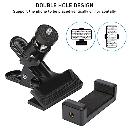 【Rotazione a 360 °】L'uso di una sfera rotante a 360 gradi consente al nostro supporto per clip per telefono di ruotare in direzione universale. Ci sono due fori sull'adattatore del supporto del telefono, che possono essere installati orizzontalmente e verticalmente. Lavora con una sfera rotante, che si tratti di suonare la chitarra o di filmare video, puoi regolare il supporto del telefono da scrivania con un'angolazione adeguata in base alle tue esigenze.