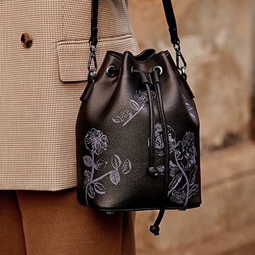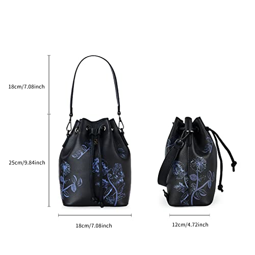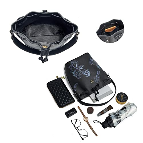 VICTORIA HYDE Borsa a secchiello da donna in pelle borsa a tracolla nera piccola borsa hobo multifunzionale borsa con stampa fiori (Nero)