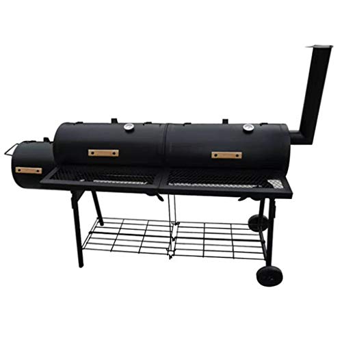 Questo è un barbecue affumicatore doppio, con 2 camere per il fumo. L'affumicatore del barbecue è dotato di 2 superfici di lavoro, una presa d'aria e un termometro.