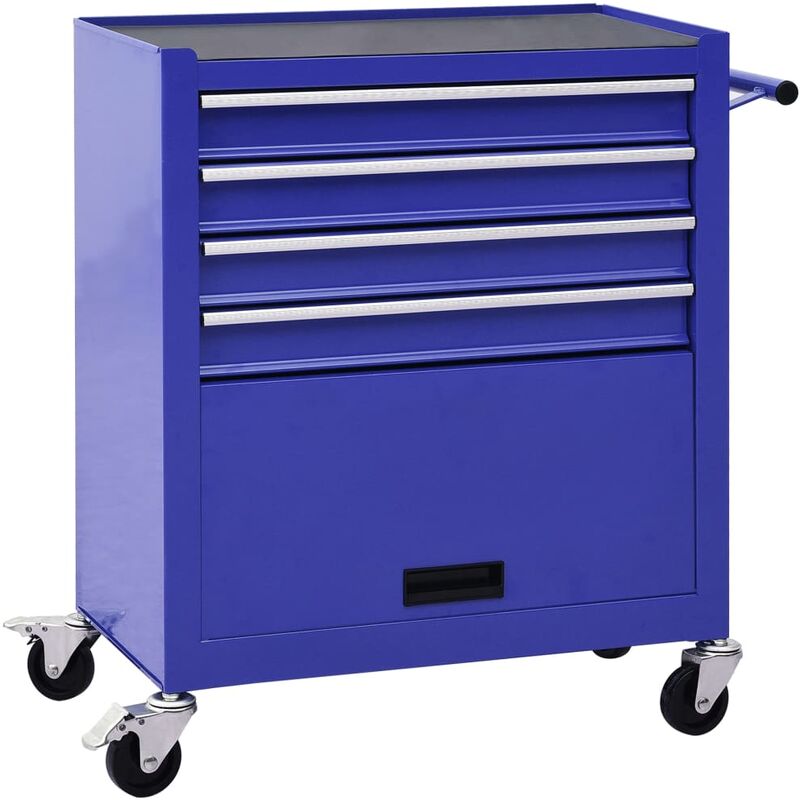 Colore: Blu Materiale: Acciaio Dimensioni complessive (con ruote): 62 x 33 x 76 cm (L x P x A) Dimensioni complessive (senza ruote): 62 x 33 x 65,5 cm (L x P x A) Dimensioni totali cassetti (4 cassetti): 50 x 30,5 x 65 cm (L x P x A) Dimensioni scomparto grande: 50 x 30,5 x 25 cm (L x P x A) Include 4 cassetti scorrevoli Superficie antigraffio Costruzione durevole con 4 ruote girevoli (2 con freni) Assemblaggio richiesto: Sì Prendete questo pratico carrello portautensili con 4 cassetti scorrevoli per riporre e organizzare i vostri strumenti. Ogni cassetto ha un rivestimento inferiore antiscivolo per mantenere i vostri strumenti in posizione. Realizzato in acciaio, questo carrello è robusto e stabile. Grazie alla serratura integrata, tutti i cassetti possono essere bloccati contemporaneamente, impedendo che si aprano accidentalmente quando il carrello viene spostato. Due delle ruote piroettanti sono dotate di freno. Il robusto piano di lavoro dell'armadio per attrezzi è un ottimo punto