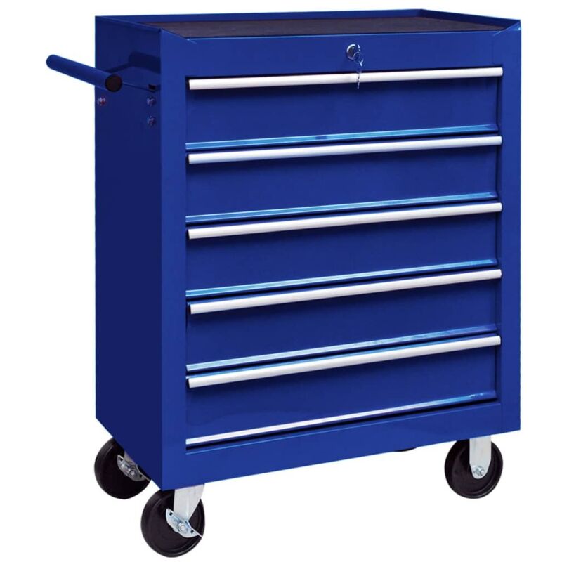 Usate questo carrello comodo con 5 cassetti scorrevoli per depositare e mantenere in ordine i vostri strumenti. Ciascuno dei cassetti ha un rivestimento antiscivolo sul fondo, quindi gli strumenti non scivoleranno. Grazie al sistema di chiusura integrato, tutti i cassetti possono essere chiusi facilmente, quindi non si apriranno in modo accidentale quando il carrello viene spostato. Due ruote sono dotate di freno. Il piano superiore robusto del carrello sarà perfetto per poter tenere a portata di mano gli attrezzi che usate di più. Il manico laterale per spostare il carrello è molto comodo. Colore: Blu Materiale: Acciaio Dimensioni di ingombro (con ruote): 690 x 330 x 772 mm (L x P x A) Dimensioni del cassetto: 510 x 290 x 100 mm (L x P x A) Con 5 cassetti scorrevoli Bloccabile Superficie antigraffio Costruzione durevole con 4 ruote piroettanti (2 con freno) Assemblaggio richiesto: Sì