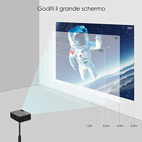 ▶GRANDE ESPERIANZA VISIVA◄ La grandezza della Proiezione è da 45 a 200 pollici, con una distanza che varia da 1.5 a 5.5 metri. la risoluzione nativa è 1280*800 e,proiettore supporta l'intero hd 1080p.I tuoi occhi non saranno più stanchi anche se guarderai a lungo.