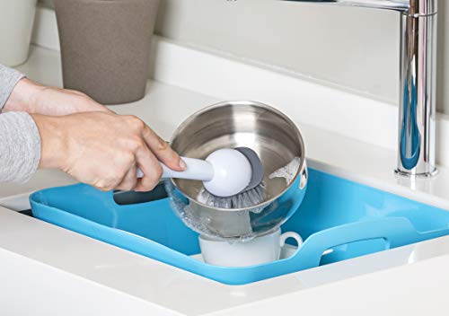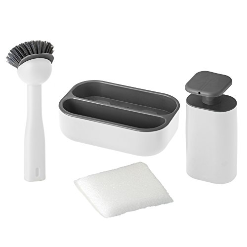 Set compatto con spazzola lavapiatti, spugna e dispenser di sapone.