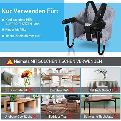 Design antiscivolo - Il design a denti di sega della seggiolona per bambini è resistente e antiscivolo, proteggendo il piano del tavolo e la sicurezza del bambino. Adatto alla maggior parte dei tipi di tavoli con uno spessore tra 20 e 85 mm (da 0,8 a 3,35 pollici).
