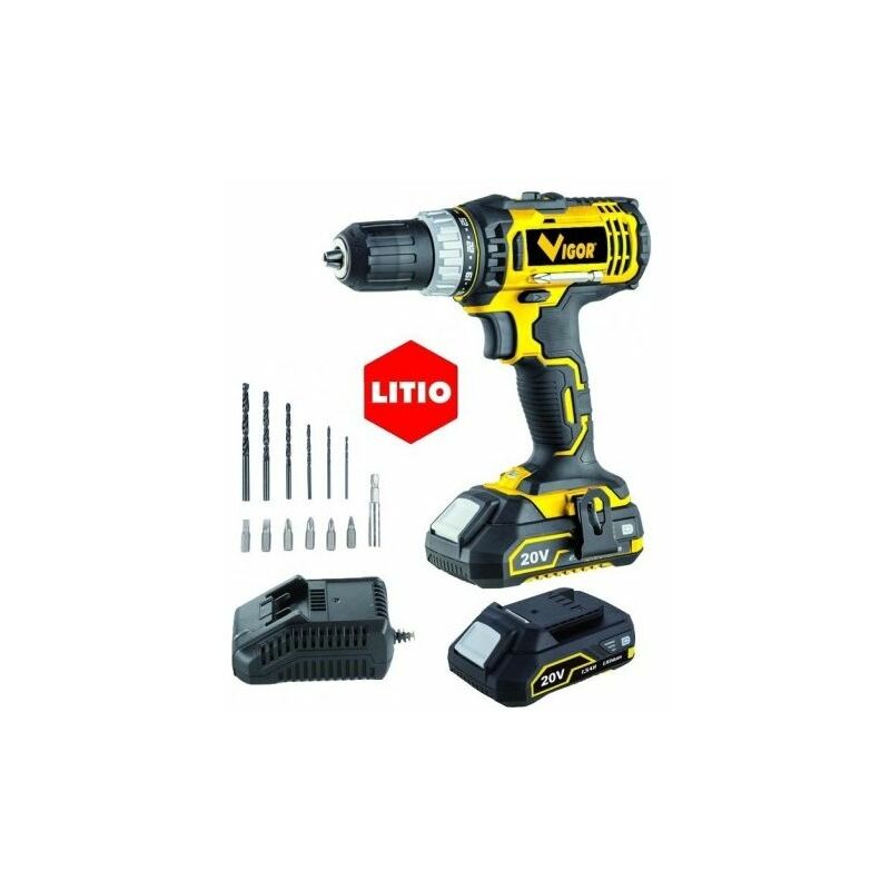 Codice: 8011779289031 Marca: VIGOR-BLINKY. Trapani Vigor VI-T20 Litio - reversibile led mandrino 13 mm - coppia di serraggio 25+1 35 nm - 2 velocita 0-400/0-1400 g/min - 2 batterie Litio 20V 1,5 ah - carica 1h valigia + 13 accessori
