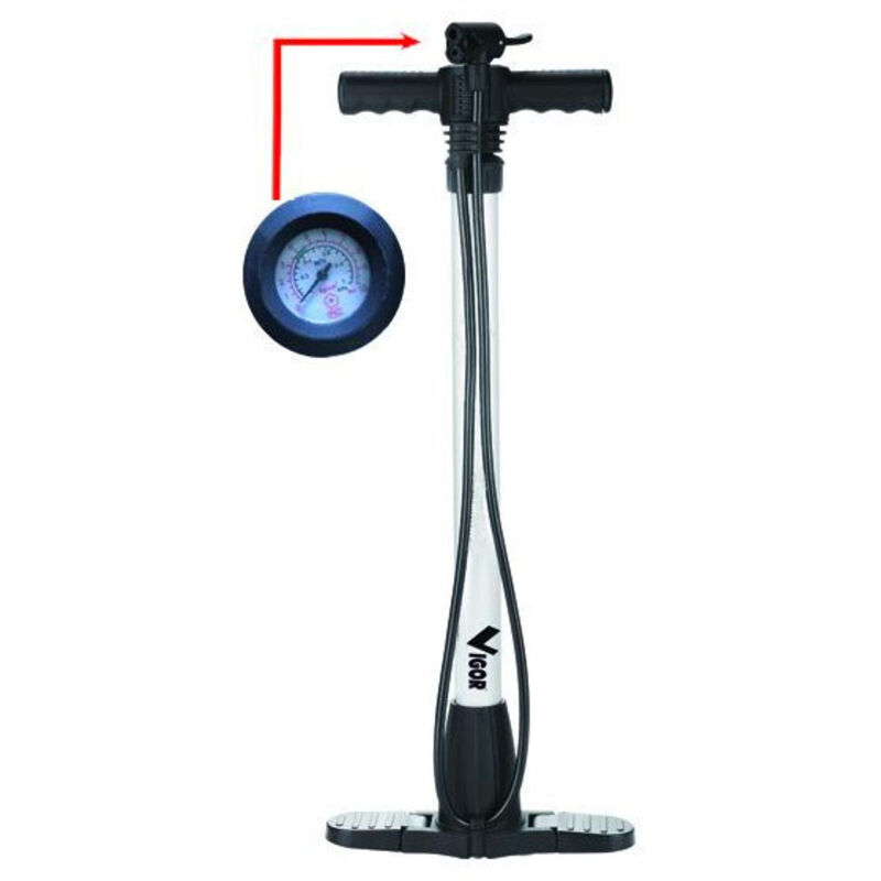 POMPA PER CICLI VIGOR Pompa per biciclette del tipo a treppiede Comoda per il gonfiaggio di qualsiasi tipo di pneumatico da bicicletta anche ad alta pressione Utile anche per il gonfiaggio di materassini e gommoni Dotata di manometro per la verifica della pressione di gonfiaggio corpo in alluminio diametro stelo 38mm altezza pompa 63,5cm pressione max 10 bar manometro