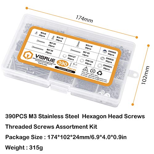 VIGRUE - Kit di 390 viti a testa esagonale M3, bulloni a esagono incassato, in acciaio inossidabile 304, con rondelle piatte e dadi assortiti