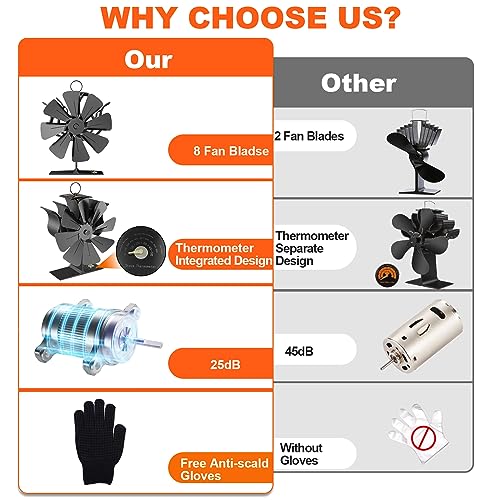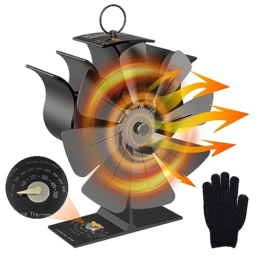 Viitech Ventola per Stufa, Ventilatore per Stufa a Legna 8 Pale Funzionamento Silenzioso, Senza Elettricità Alimentato Calore Ventola Ossido di alluminio con Barre Della Temperatura (Include Guanti)
