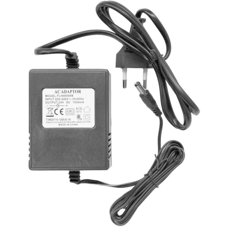 Adattatore CA per la ricarica di batterie per auto orientabili per bambini. Modello: FLH480608 Ingresso: 220/240 V @ 50 Hz Uscita: 24 C CC - 1000 mA Dimensione della confezione: 13x10x7 cm
