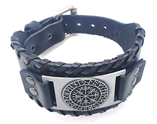 Vikinger - Bracciale Vegvisir con bussola vichinga, in pelle, metallo, colore: nero/argento