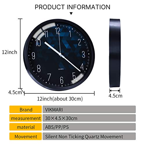VIKMARI Battery Operated Orologio da Parete Silenzioso Non ticchettio dell'orologio Moderno di Numeri Arabi Rotondi di Vetro Clocks Indoor Blu e Nero 12 inch