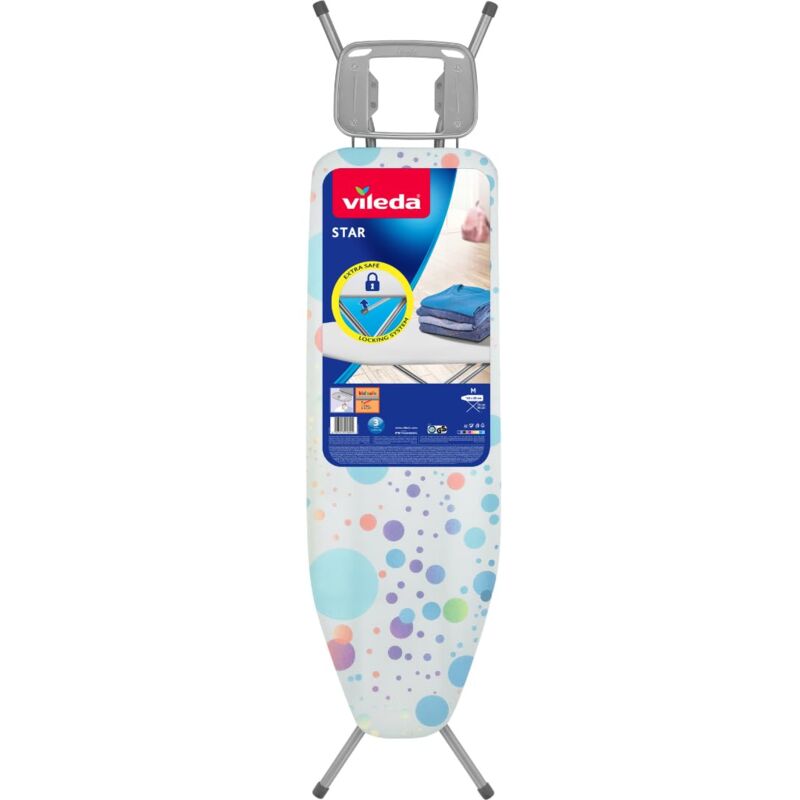 L'asse da stiro Vileda Star è l'asse da stiro perfetto se siete alla ricerca di un asse da stiro medio che debba soddisfare le esigenze di una famiglia occupata. Il rivestimento in 100% cotone offre una superficie liscia e resistente al calore per risultati senza pieghe, mentre lo strato di schiuma sottostante garantisce una distribuzione uniforme del calore per una stiratura efficace. Il sistema Kid Safe Pull & Lift è una caratteristica di sicurezza che impedisce alla tavola di crollare accidentalmente e consente di regolare l'altezza della tavola in base alle proprie esigenze durante la stiratura. Il robusto telaio in acciaio e i piedini antiscivolo assicurano che la tavola rimanga stabile. Vileda è un marchio rinomato che fornisce soluzioni di pulizia rivoluzionarie alle famiglie dal 1948. Gli assi da stiro vanno da opzioni semplici e convenienti a opzioni premium con molteplici funzionalità. Progettati per rendere la stiratura più facile e confortevole, questi assi da stiro