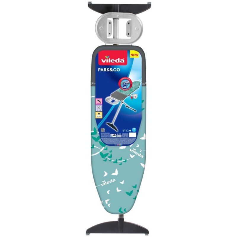 Asse da stiro Vileda Park and Go Superficie: 120 x 38 cm Colore: grigio/menta Altezza regolabile fino a 97 cm Sicurezza bambini Click & StopBase extra larga per una maggiore stabilità