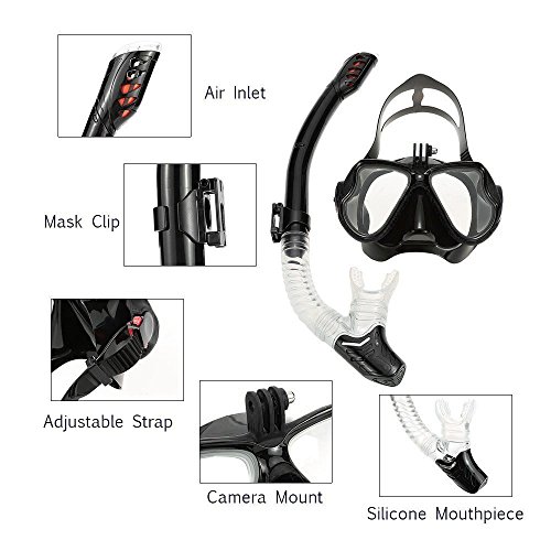 VILISUN Set Snorkeling Subacquea o Immersioni Tubo, sub-visione ampia e limpida antinebbia antiperdita per adulti, Vetro temperato materiale professionale, cinturino silicone morbido regolabile Nuoto Occhiali con Supporto per fotocamera Gopro con Snorkel Full Dry,Nero SET