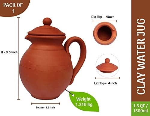 Dimensioni: diametro della brocca superiore: 11,4 cm, diametro inferiore: 8,9 cm, altezza: 24,1 cm. Capacità: contiene 1,5 litri / 1500 ml di acqua rinfrescante, fornendo una vasta scorta per dissetarsi. Confezione da 1: brocca d'acqua in argilla con coperchio,