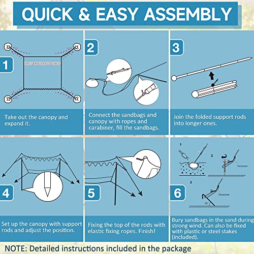 【Facile da montare】La tenda da spiaggia con ancoraggio di sabbia è facile da montare seguendo le istruzioni. I robusti pali in alluminio dell'ombrellone garantiscono un'elevata stabilità. Tutte le parti del Sun Shelter possono essere riposte nella borsa e pesano solo 2,1kg, rendendole facili da trasportare.