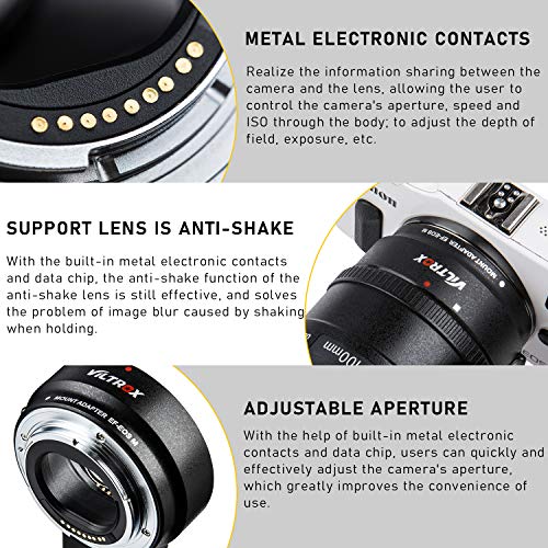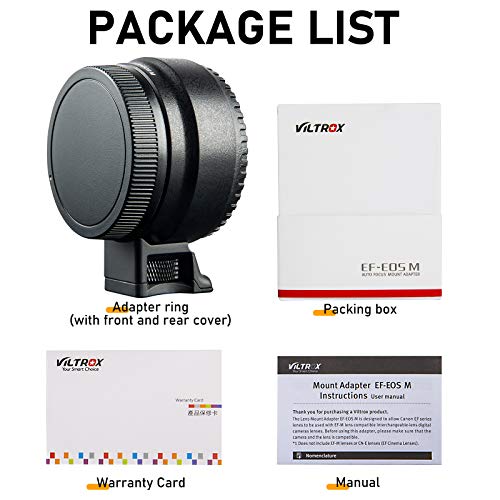 Compatibilità professionale: l'adattatore Viltrox EF-EOS M consente di utilizzare obiettivi Canon EF ed EF-S su fotocamere digitali mirrorless Canon EOS-M M2 M3 M5 M6 M10 M50 M100. Contattaci se non sei sicuro che questo anello adattatore per obiettivo sia adatto alla tua fotocamera.