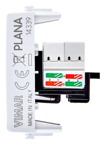 Vimar 14339.6 Plana presa rj45 con connettore netsafe cat. 6, non schermata, cablaggio universale t568ab, 8 contatti, morsetti ad incisione d'isolante compatibile 110, bianco