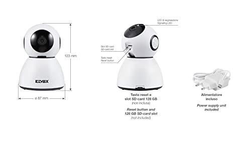 Vimar 46239.040A telecamera pt IP Wi-Fi motorizzata a colori daynight, risoluzione full-hd (2 megapixel, 1920x1080), obiettivo fuoco fisso 4 mm con visione 96°, filtro IR meccanico, compressione h264, alimentazione 5 vdc con alimentatore a spina incluso, IR 10 m, funzioni rilevatore di movimento e invio notifiche. App gratuita view product disponibile per android e iOS. Supporta sd-card fino a 128 GB (non inclusa), standard wifi ieee 802.11 b/g/n 2.4 ghz. Compatibile con assistenti vocali. Dimensioni diametro 87 x 123 mm. Peso 185 g.