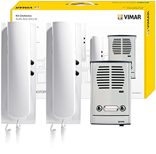 Vimar 885E Kit citofono da parete per impianto bifamiliare con collegamento a 4+2 conduttori contenente 1 placca grigio luce da parete con 2 pulsanti 88TD, 1 unità elettronica 930C, 2 citofoni da parete bianco, 1 trasformatore M832