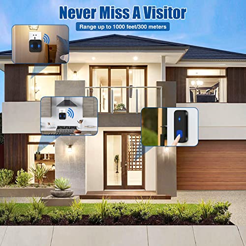 【Flash LED】 Il LED blu lampeggiante sul pulsante e sul ricevitore è un'indicazione visiva per l'ospite e il visitatore, è anche un design divertente e meticoloso per i non udenti, poiché si illumina quando è in uso. La distanza tra il ricevitore e il trasmettitore può essere fino a 300 metri.