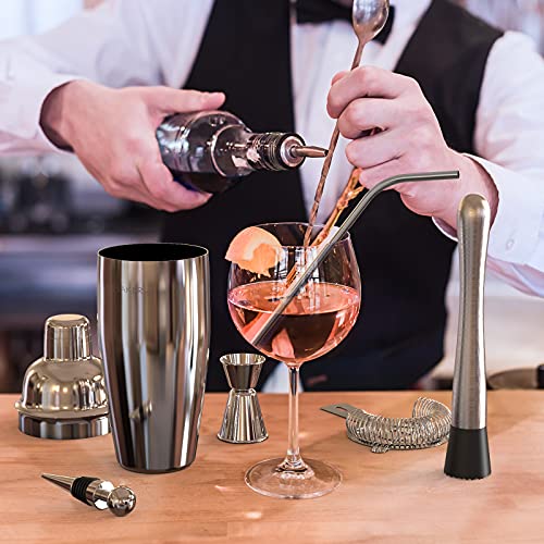 [CONTENUTO] - Shaker professionale cobbler, misurino doppio jigger, pestello in acciaio inossidabile, cucchiaio da miscelazione attorcigliato, versatori a flusso libero, colino da cocktail Hawthorne, colino da cocktail Julep, colino conico da cocktail.
