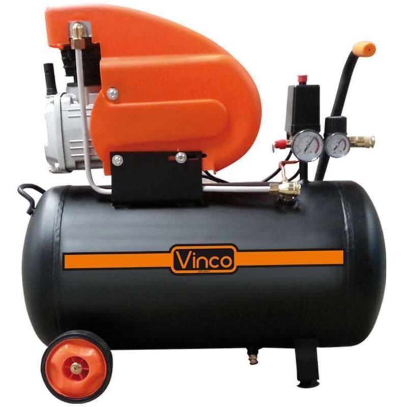 Compressore D 'aria lubrificato ad olio Vinco 24 lt Vinco: Cod. 60600/ Mod. FDL24 Compressori Vinco da 24 Litri Lubrificato, Munito di doppio Manometro, Trattamento anticorrosione, Ruote e maniglia per trasporto. Dati tecnici: Capacità serbatoio: 24 Litri / Spessore 2.5 mm Rumorosità (misurata): 76 Db Pressione: 8 bar Potenza: 2,0 Hp Aria aspirata: 188 l/m Tensione / voltaggio: 230V / 50 Hz Giri per minuto: 2850 rpm Dimensioni prodotto: 62x25x60 cm Peso netto/lordo: 17.6/18.9 Kg Caratteristiche: Doppio manometro per il controllo immediato della pressione in entrata e in uscita Trattamento anti corrosione del serbatoio e valvola di spurgo nel lato inferiore per operazioni di pulizia ordinaria Doppio attacco uscita aria per poter lavorare con due elettroutensili contemporaneamente 2 ruote posteriori in gomma e maniglia in metallo per agevolare gli spostamenti 2 Piedini Anteriori Tasto Accensione / Spegnimento