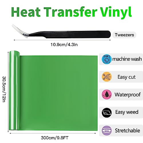 Vinile Termoadesivo per Tessuti - 30,5 CM X 3M (Pinzette Incluse) Termovinile per Tessuti Termoadesivo Pellicola per Plotter per T-shirt,Altri Tessuti, Facile da Tagliare e Sarchiare,Verde