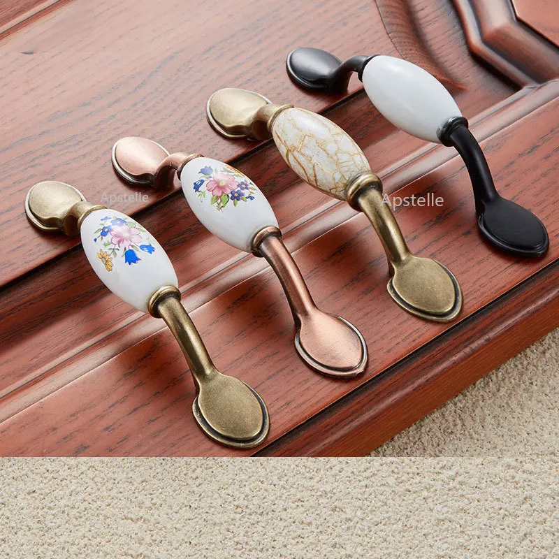 Vintage Ceramic Knob Metal Retro Handle Pull Button Ceramic Cabinet Chinese Flower furniture Hardware 74mm-153mm Single/double