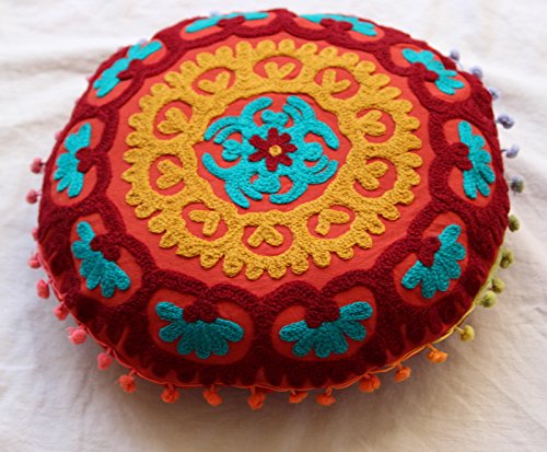 HANDICRAFTOFPINKCITY 16'' Vintage Round Cushion Cover Suzani Embroidered Cotton Pouf Cover Indian Decorative Pillow Cover