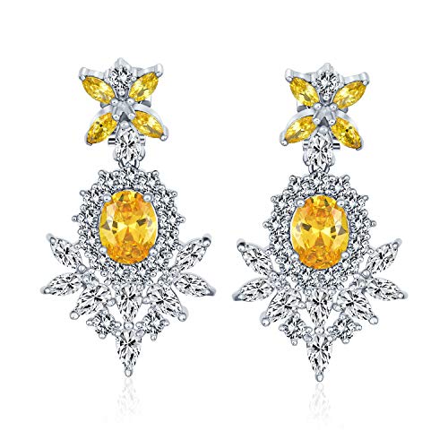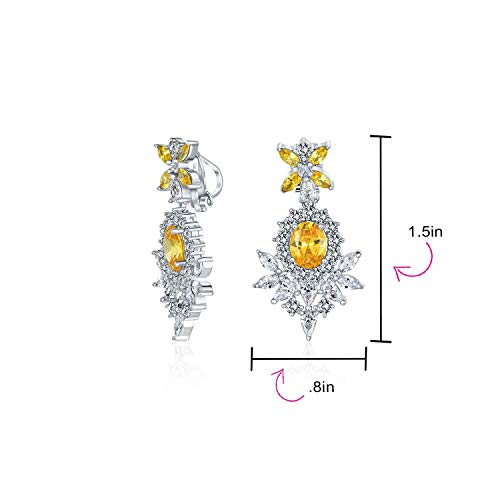 Vintage Art Deco Style Canary Yellow Cubic Zirconia AAA CZ Statement Dangle Formal Chandelier Clip On Earrings Wedding Prom Pageant Silver Plated