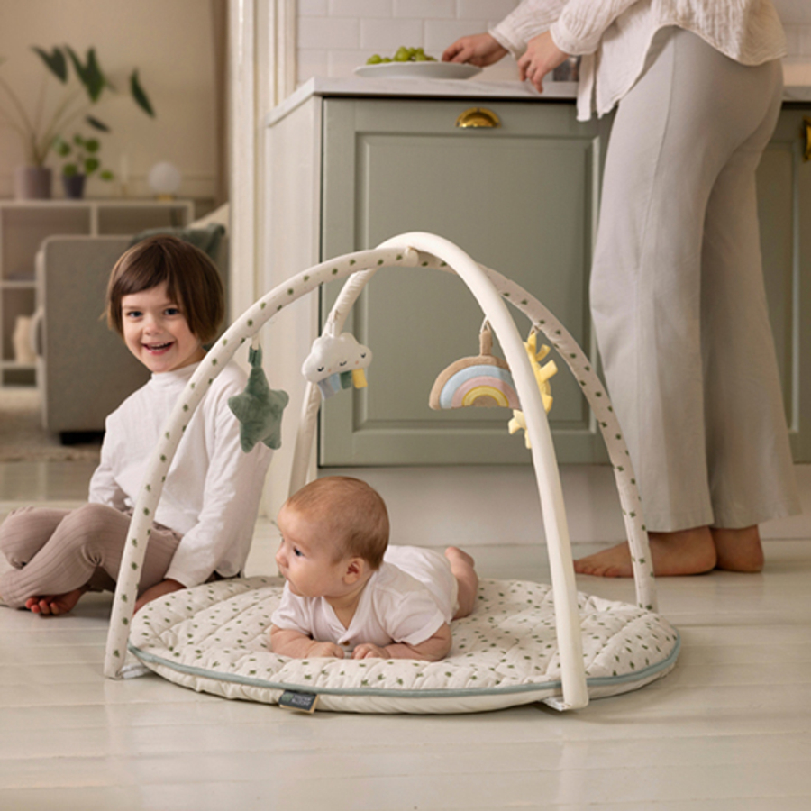 Dettagli del prodotto: Morbido tappeto da gioco imbottito con fiocchi rimovibili. Quattro figure di gioco: stella con campana, nuvola con scricchiolio, arcobaleno e sole. Ulteriori passanti sui fiocchi per appendere le figure a diverse altezze. L'arco di gioco è certificato CE e soddisfa i requisiti della norma EN71. Materiale e cura: Materiale esterno: certificato GOTS, 70% cotone (organico), 30% lino. Parte inferiore e imbottitura: poliestere certificato Oeko-Tex. Certificato CE e conforme ai requisiti della norma EN71. Lavabile in lavatrice per delicati a 40°C Figure Lavare a mano e smacchiare i fiocchi Dimensioni e peso: Diametro 80 cm, altezza 58 cm
