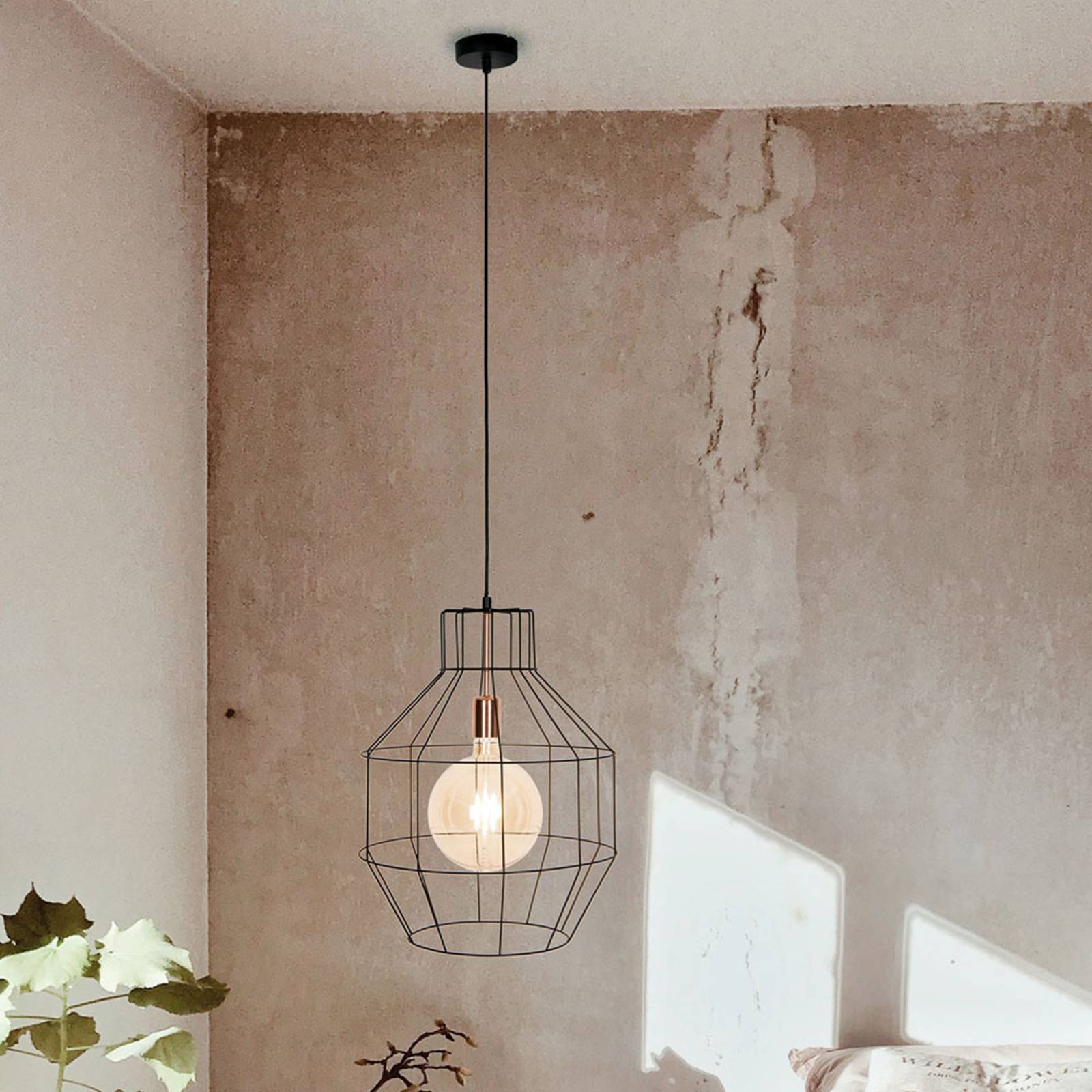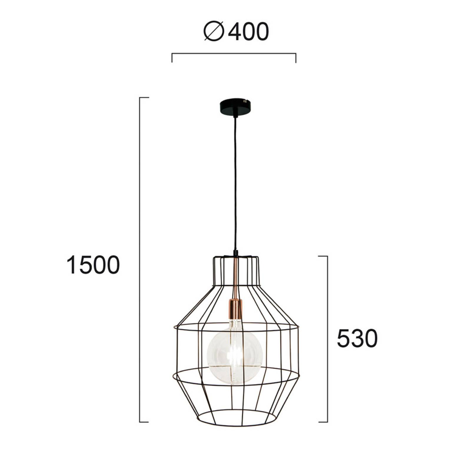 Lampada a sospensione moderna Nexus con paralume a gabbia L'ampio paralume della lampada a sospensione Nexus in look cage irradia la luce non solo direttamente verso il basso, ma anche tutto intorno attraverso le fessure dei montanti in acciaio. Poiché la lampada ha dei montanti molto stretti ed eleganti, ha un aspetto molto moderno e delicato, che le permette di essere integrata in quasi tutti gli stili di interni. Grazie all'emissione di luce tutt'intorno, è ideale per l'illuminazione generale. La sospensione e l'ombra sono progettati in nero, mentre la presa è tenuta in rame, che crea un bel contrasto e un dettaglio discreto è impostato. Come illuminante, si raccomanda di ricorrere a lampade decorative, in quanto possono essere ordinate separatamente negli accessori.