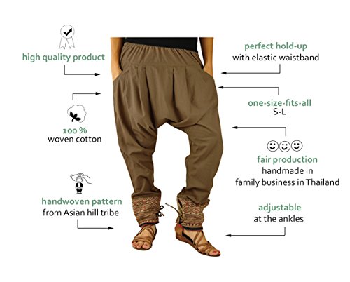 CARATTERISTICHE: I pantaloni alla turca sono di taglia unica e vestono sia l'uomo che la donna con tessiture tradizionali, decorati a mano dalle tribù asiatiche di montagna sui polpacci