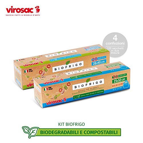 VIROSAC - Biofrigo - sacchetti per frigo e freezer biodegradabili, 2 rotoli 28x40 da 20 pezzi + 2 rotoli 23x32 da 30 pezzi, kit da 4 rotoli