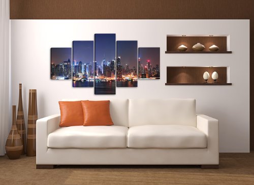 Visario 5505 - Quadro su tela, motivo: New York, 160 cm, 5 pezzi, blu bianco, legno
