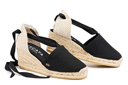 Viscata Escala Lino Espadrillas con Zeppa 6,3 cm, Lacci alla Caviglia, Punta Chiusa, Prodotte artigianalmente in Spagna