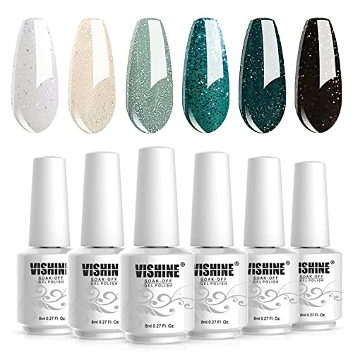Vishine Soak Off UV LED Smalto Gel Semi-Permanente Glitterato Verde - Confezione da 6 Colori Diamond Glitter Teal Verde Nero Beige