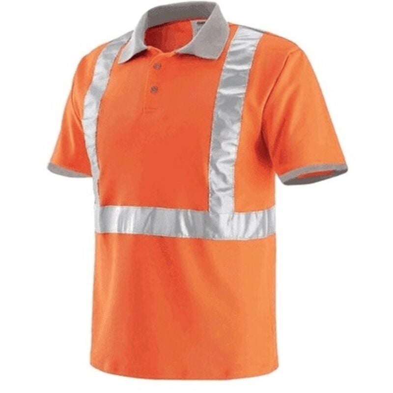 Manica corta, in tessuto piquet 100% poliestere. collo chiuso con due bottoni. bande rifrangenti alta visibilitã 3m. collo e giromanica di colore grigio. a norma uni en 13688, uni en 20471: 2013. colore arancio.xxl