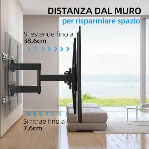 SUPPORTO TV UNIVERSALE: Questo supporto TV universale si adatta alla maggior parte dei TV da 26, 37, 42, 46, 50, 55, 65 pollici con uno schema VESA da 100x100 mm a 400x400 mm e supporta fino a 60 kg. Puoi estendere il braccio del nostro supporto TV dal muro fino a 38,6cm, e ritrarlo a soli 7,6cm, risparmiando spazio perfettamente. Sarà il supporto TV perfetto per te!