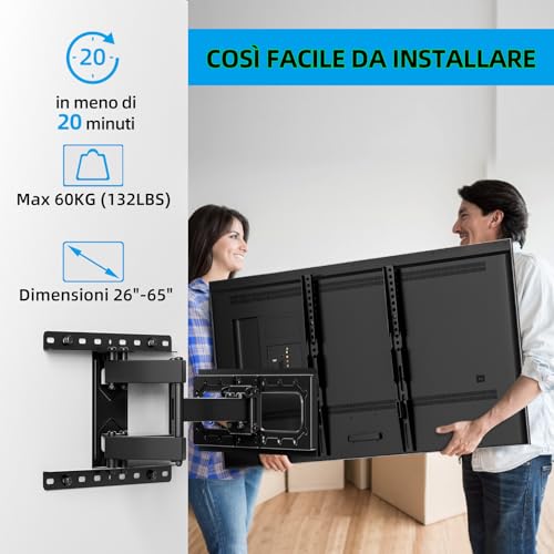 SUPPORTO TV A MOVIMENTO COMPLETO: Puoi inclinare il TV di +5°/-15°, inclinarlo di ±3° o ruotarlo di 60° con questo supporto a parete per offrire la migliore visione. NOTA: Il manuale indica che è applicabile ai TV da 26 a 65 pollici, il supporto TV può essere perfettamente applicabile!