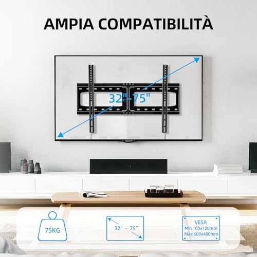 【Ampia Compatibilità】 Il supporto TV parete HOME VISION è compatibile con la maggior parte dei TV LED LCD OLED piatti/curvi da 32 a 75 pollici, fino a 75kg, con un massimo di VESA 600 x 400 mm. Compatibile con marche come Samsung, LG, Sony, Vizio, Philips, Panasonic, Thomson, Toshiba, Sharp, TCL, Hisense, e altre.