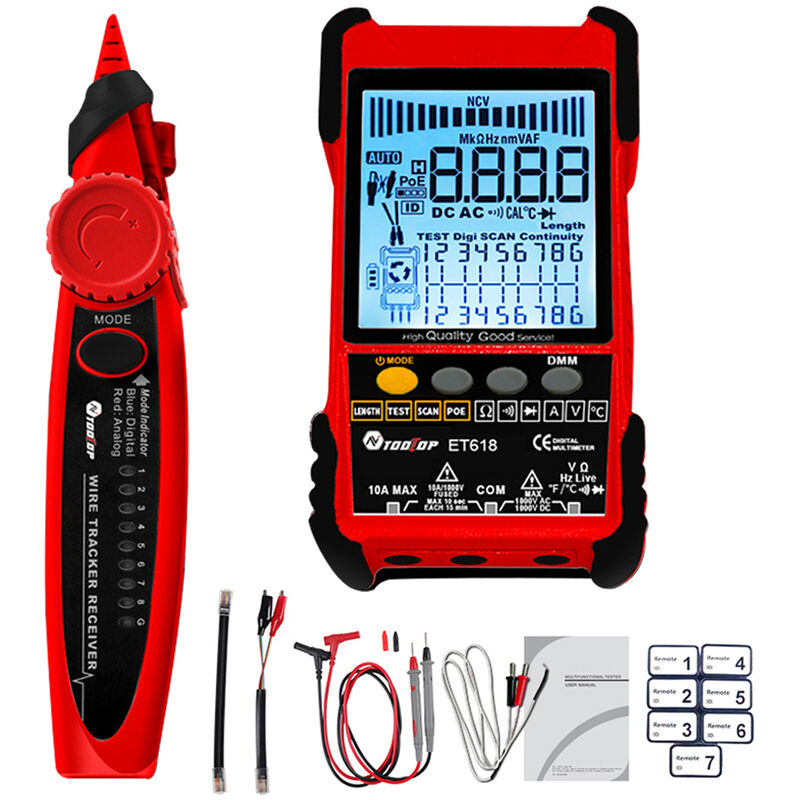 Questo misuratore si combina con le funzioni di tracciamento dei cavi e di misurazione della lunghezza del cavo. Il vantaggio di questo misuratore è che il suono chiaro a lunga distanza segnala la misurazione rapida e precisa della lunghezza del cavo. Il misuratore è uno strumento pratico per laboratori, fabbriche, installatori di reti radioamatori e tecnici. Può misurare in tempo reale la lunghezza del cavo di rete, il cortocircuito e l'interruzione del circuito. La funzione di tracciamento dei cavi può trovare in modo rapido ed efficiente il cavo di destinazione in un gran numero di cavi. Questa funzione può essere utilizzata in sistemi telefonici, reti di computer, cavi BNC e altri cavi di rete in metallo. Caratteristiche: Funzione di tracciamento dei cavi: la funzione di tracciamento dei cavi può trovare in modo rapido ed efficiente il cavo di destinazione in un gran numero di cavi. Questa funzione può essere utilizzata in sistemi telefonici, reti di computer, cavi BNC e altri