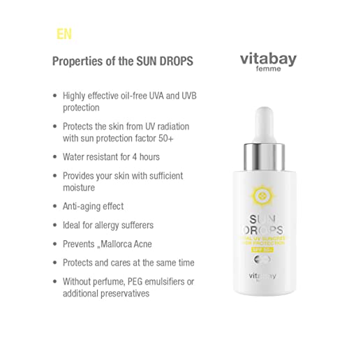 ✅ PROTEZIONE UV - Vitabay Sun Drops 40ml offre una protezione UVA e UVB altamente efficace, con fattore di protezione solare 50+. Una corretta progezione contro i raggi UV è essenziale per la salute del vostro viso. La salute è la nostra passione! La salute e il benessere dei nostri clienti sono stati al centro di tutte le nostre decisioni fin dall'inizio.