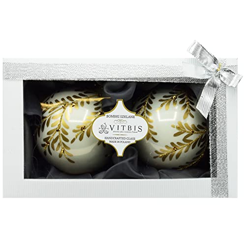 Vitbis Set di 2 decorazioni per albero di Natale, diametro 10 cm, colore bianco latte con decorazioni floreali dorate e glitter, fatte a mano, in confezione regalo con nastro